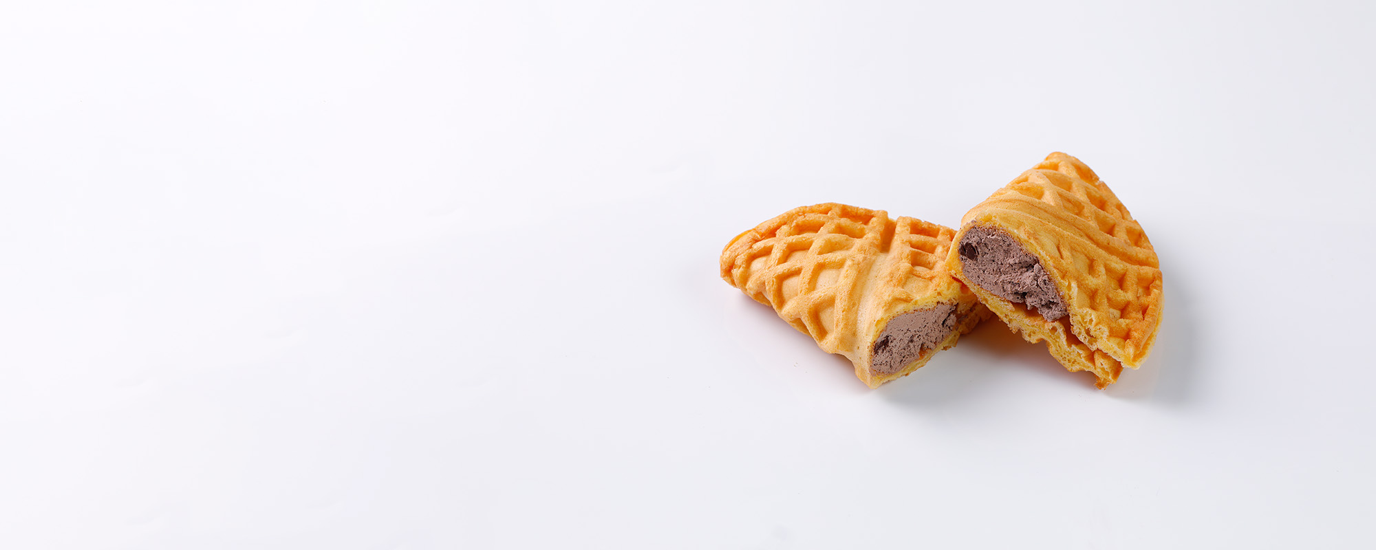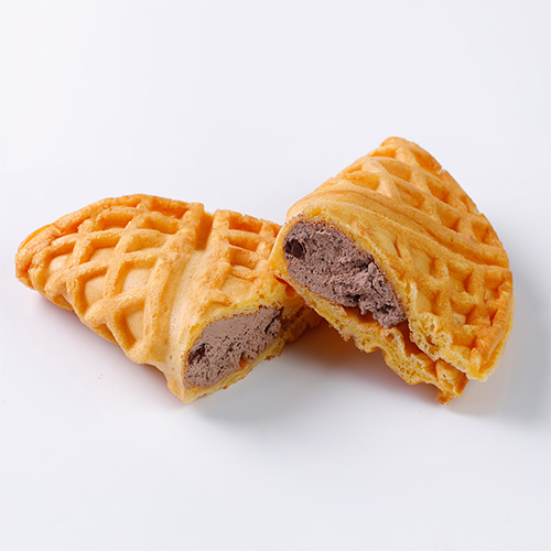 もちもち生地のアメリカンワッフルで、チョコクリームをたっぷりと包みました。お子様からお年寄りまで食べやすい味のクリームワッフルです。