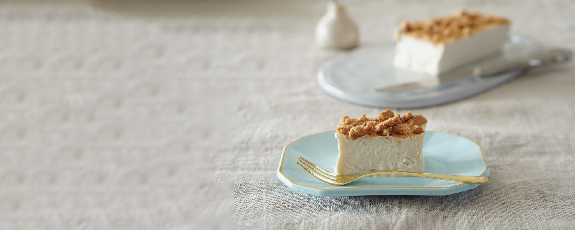 北海道産クリームチーズと生クリームを使用した、滑らかな口当たりと爽やかな酸味が魅力のレアチーズケーキです。トッピングのクッキーがアクセント。